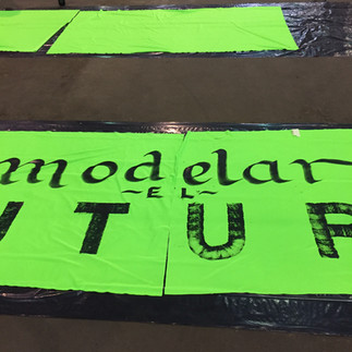 En ese marco, se nos convocó junto con Fernanda Piñeirua y Daniela Beracochea a pensar un taller con el fin de realizar una intervención gráfico-espacial en la nave central del edificio, que se expondría el día de la inauguración de este Nuevo Mercado Modelo, coincidente con el Día del Patrimonio. El taller se llevaría a cabo con estudiantes de la Licenciatura en Diseño de Comunicación visual de FADU, estudiantes del Liceo 64 del barrio Mercado Modelo. La propuesta de trabajo involucraría, entonces, el diseño y pintada de pasacalles que compondrán la instalación con contenido recabado de un intercambio participativo con el barrio y lxs vecinxs, el entorno, las paredes, la arquitectura y el valor simbólico de la memoria colectiva de un lugar emblemático que se está transformando.